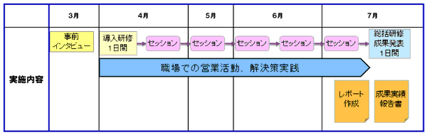 営業マネージャー向けにリーダーシップ開発とそれぞれのマネージャーが現場で抱えている問題の解決を実践した営業変革事例。4ヶ月で全7回のプログラム実施で、営業活動のナレッジとスキルの共有化と新しい取り組みの創出やチームによる問題発見力・問題解決力の強化をテーマに取り組みました。具体的な成果としては、営業プロセスの改善や顧客へのアンケート調査に基づいた顧客サービスの向上、具体的な顧客の攻略、代理店施策の変更などが実現しました。また、営業マネージャー同志の横の結束力が高まり、プログラム終了後も自主的な問題解決ミーティングを定期的に開催されています。